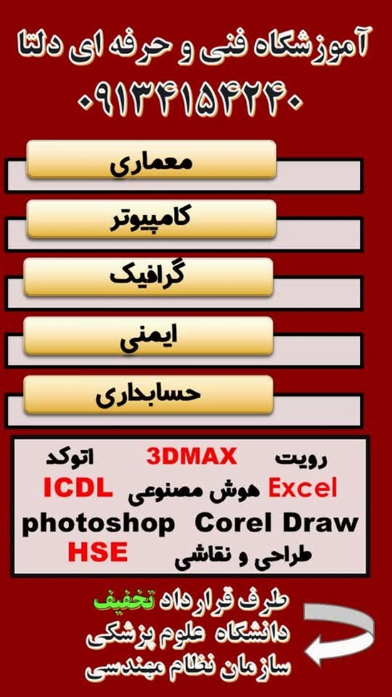 آموزشگاه فنی و حرفه ای دلتا با برگزاری کلاسهای آموزشی (معماری ،کامپیوتر،گرافیک ،ایمنی ،حسابداری )با تخفیفات 15 درصد ویژه پرسنل و اعضای خانواده دانشگاه علوم پزشکی رفسنجان